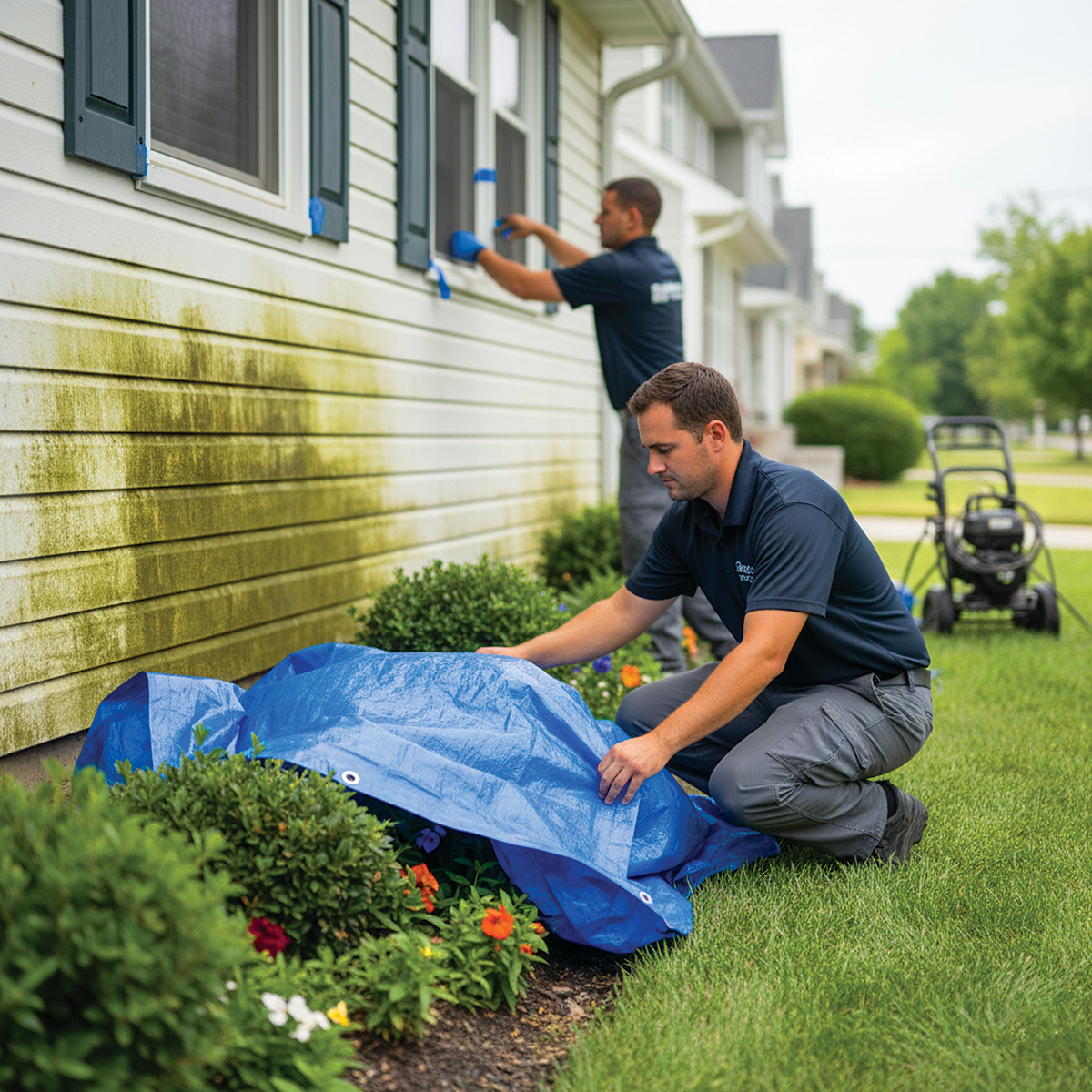CAREFUL PREPARATION OF THE AREA, PROTECTING LANDSCAPING AND VULNERABLE ELEMENTS.